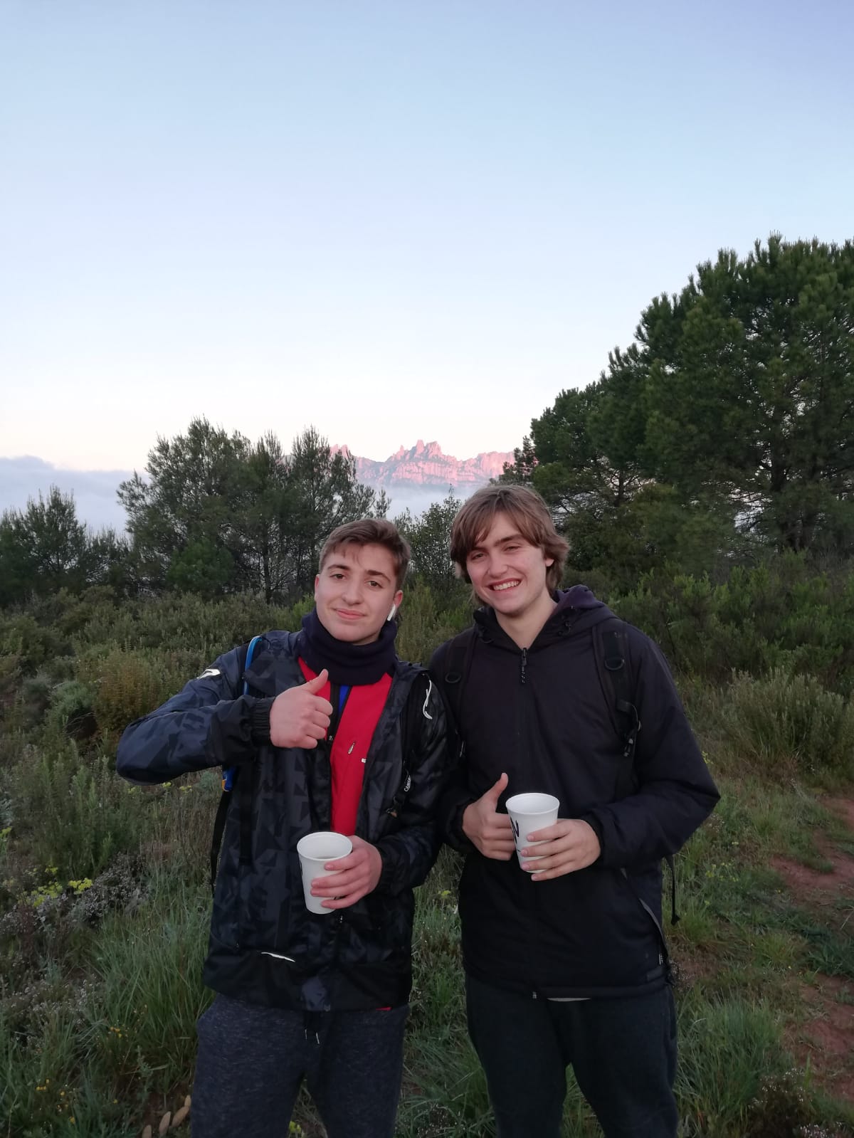 El reto empieza antes de partir, aún tener toda la ropa preparada, lo realmente importante era que tenía que llevarme en la mochila, sólo quería lo justo y necesario para pasar la noche ya que no quería llevar peso de más y cargarlo en la espalda durante las 14 horas consecuentes. Decidí llevarme 1,5l de agua barritas de chocolate y dos bocatas grandes. Aún que no lo parezca si sumamos el peso de la ropa de repuesto que llevaba encima, sabía que la mochila se me haría pesada en cierto punto de la noche. Llega el momento de partir, lleva lloviendo desde la mañana, factor que ha hecho que algunos compañeros se retiren. Los demás decidimos continuar sin importar el tiempo, otra dificultad a superar. Durante las 3 horas de lluvia mezcladas con la gran cantidad de barro y niebla, tuve un pensamiento contínuo; madre mía dónde me he metido. Pero este pensamiento sólo aparecía en ciertos momentos, cuando no estaba distraído por mis compañeros u observando la naturaleza. A medida que pasaba el tiempo la lluvia iba cesando, la niebla desapareció pero el barro no , el barro, junto a los charcos y riadas, nos acompañaría durante todo el camino. Pasaban las horas y se hizo de noche, sólo nos iluminaban nuestras linternas y, de vez en cuando, las farolas de los pueblos por los que pasábamos. A medida que pasábamos por diferentes poblaciones cada vez me pesaba más la mochila y notaba molestias. Sobre las 2 de la noche tuve un bajón; estaba cansado, tenía las piernas cargadas, los pies mojados, hacía bastante frío y hacía unas 3 horas que no parábamos para descansar. En este punto de la noche no tenía claro que llegaría hasta Montserrat pero entonces, un amigo, me dejó un airpod y nos pusimos a escuchar música. No sabeis lo reconfortante que es escuchar música cuando estás quemado y a más cantando con tu amigo. Desde este punto se me hizo más llevadero hasta la siguiente parada a las 3 de la noche. Hicimos dos paradas prácticamente seguidas y en la última, un compañero me dio un sobre de glucosa para revivar las fuerzas. La compartí con un amigo que lo necesitaba igual o más que yo y a los dos nos sentó de maravilla. Estos ánimos se acabaron sobre las 7 de la mañana, empezábamos a ver Montserrat pero lo veíamos demasiado lejos como para llegar a la hora prevista. Hicimos la última parada antes de llegar al último pueblo, el cual se suponía que se encontraba a 1 hora. Los ánimos de todos fueron decayendo al ver que la hora ya había pasado y aun faltaba la mitad del camino, a todo esto, por tener prisa por llegar, nuestro “cap” (guía), se equivocó de camino y para colmó desapareció y nos dejó a 20 personas colgadas, nos tuvieron que recoger en coche y llevarnos el último kilómetro en coche.